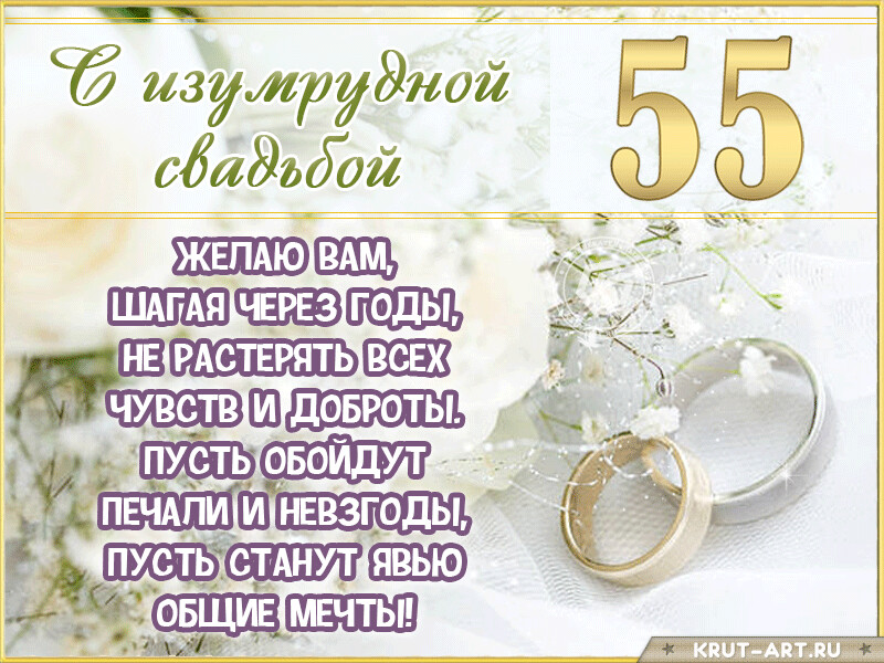 Дорогие Валентина Андреевна и Иван Николаевич Страховы! 55 лет семейного счастья - это изумрудная россыпь драгоценных мгновений! Ваш союз - образец истинной преданности и глубокой любви. Хочется пожелать Вам, чтобы ваша жизнь и дальше сияла изумрудным светом гармонии. Пусть дети и внуки радуют, а души наполняются спокойной радости от совместно прожитых лет и предвкушением новым, не менее прекрасных страниц вашей семейной саги!