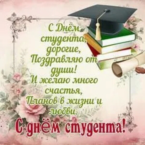 С Днем студента! Лучших вам учебных моментов и самых крутых впечатлений по жизни! Будьте настойчивы, идя к своей мечте! Успеха, побольше улыбок, веселья и напористости в достижении целей. Будьте счастливы .любимы - и дарите те же эмоции родным и дорогим людям!