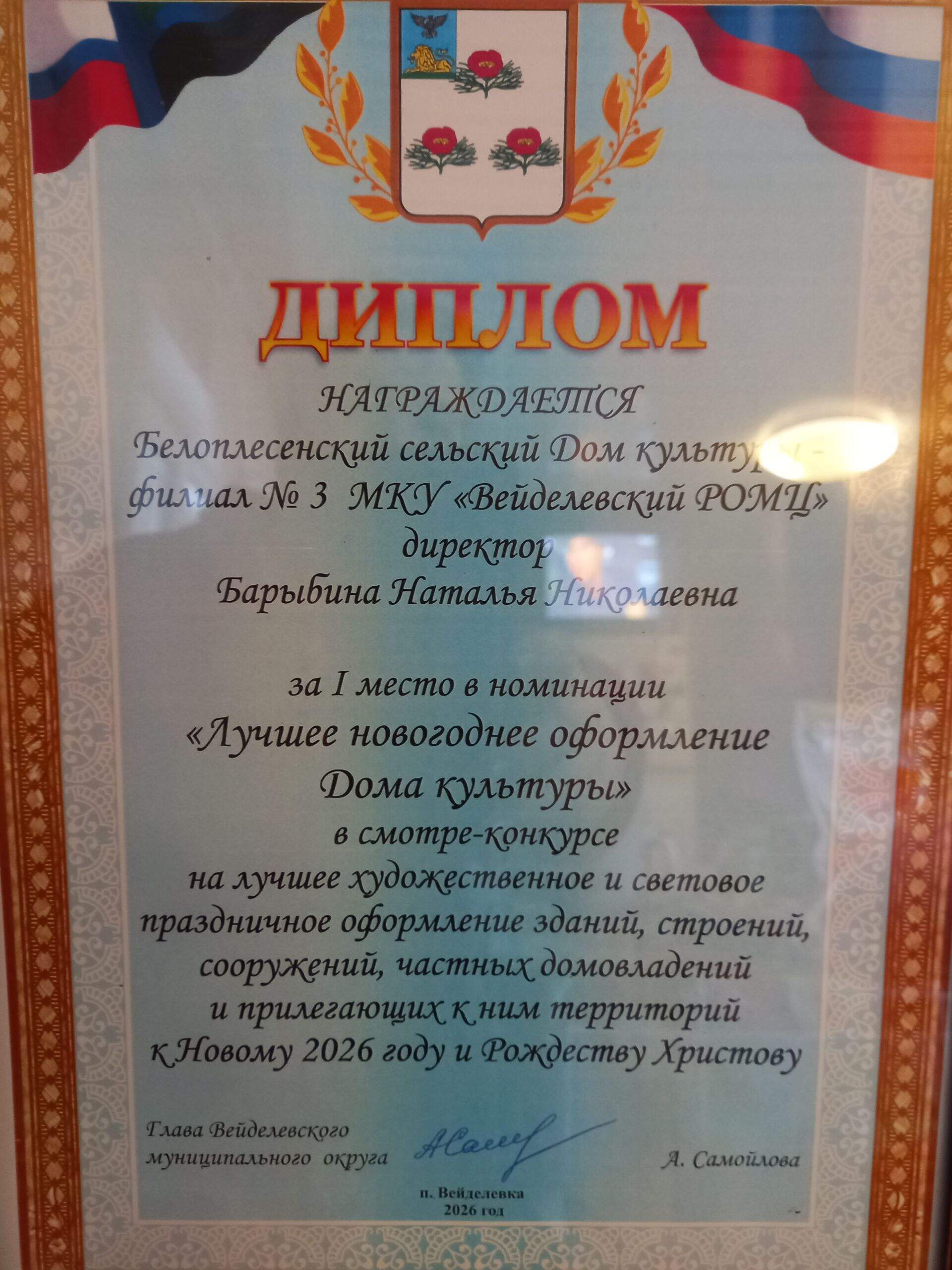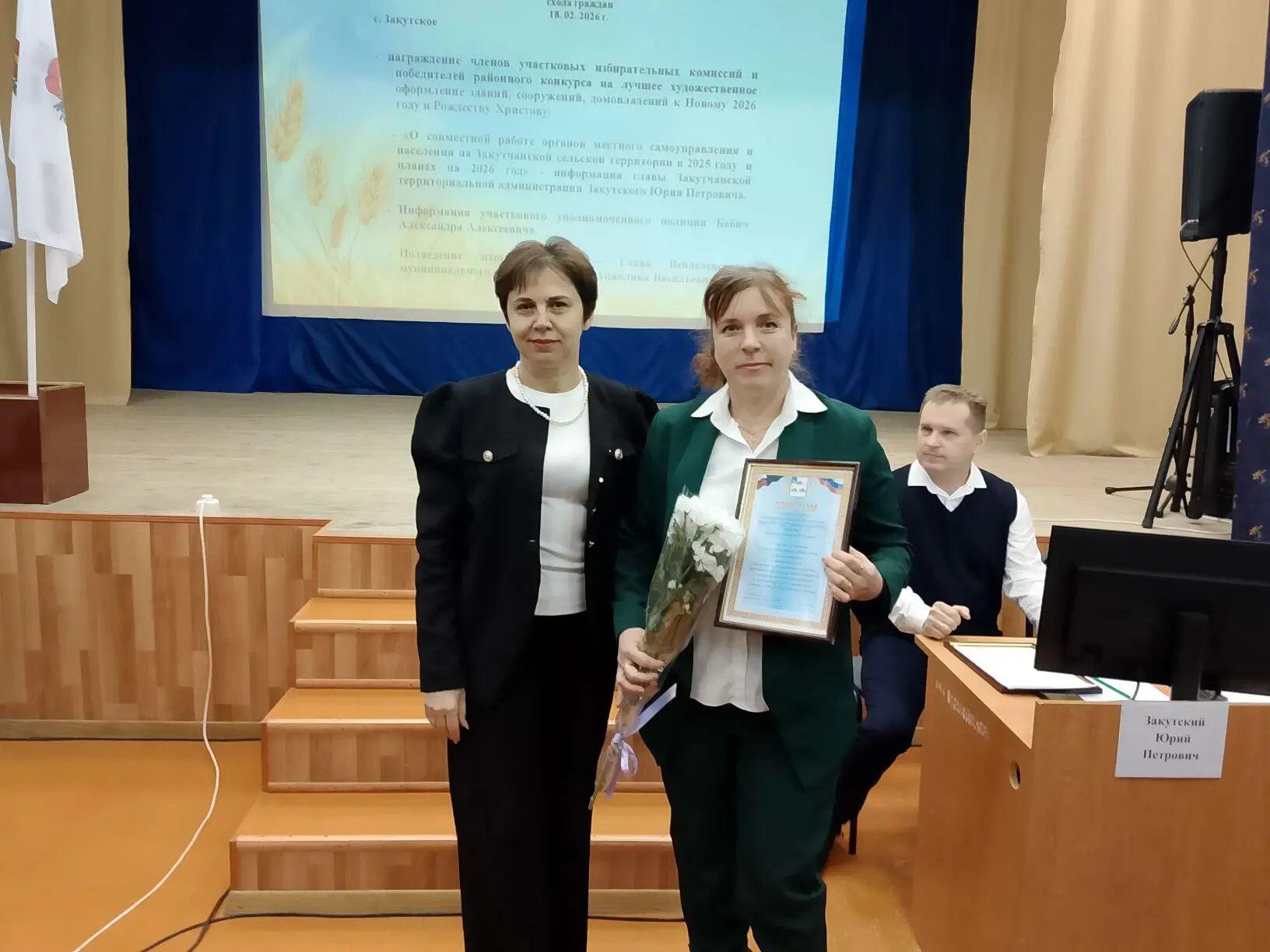 В Закутчанском ЦКР состоялось расширенное заседание Общественных советов, на котором директор Белоплесенского сельского Дома культуры была награждена Дипломом за I место номинации "Лучшее новогоднее оформление Дома культуры" в смотре- конкурсе на лучшее художественное и световое праздничное оформление зданий, строений, сооружений .частных домовладений и прилегающих к ним территорий к Новому 2026 году и Рождеству Христову.